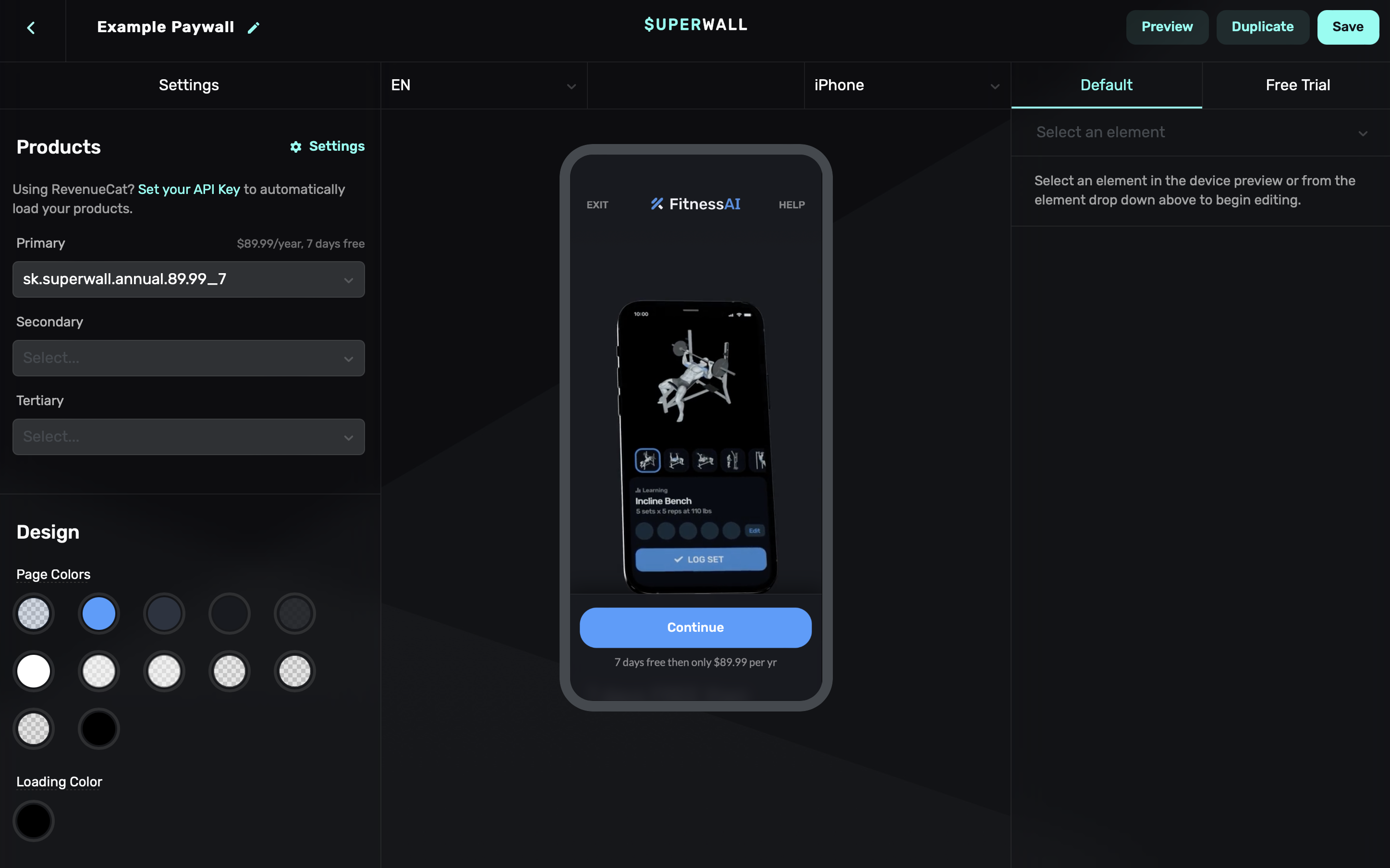 Click Try it, give it a name, and click Create. This will bring you to the paywall editor: