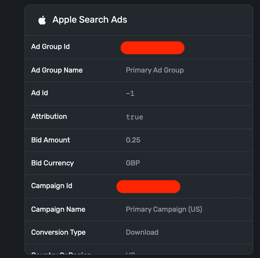 | Org Id | 3621140 | The identifier of the organization that owns the campaign. This is the same as your account in the Apple Search Ads UI. |