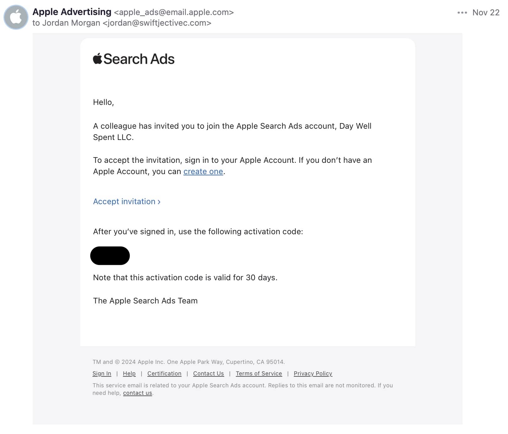 Open the email and follow Apple's instructions to set up a new user with Apple Search ads. The email will look similar to this: