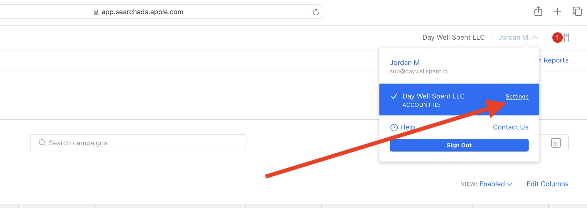 - Locate your account name in the top right corner and click Account Name -> Settings.