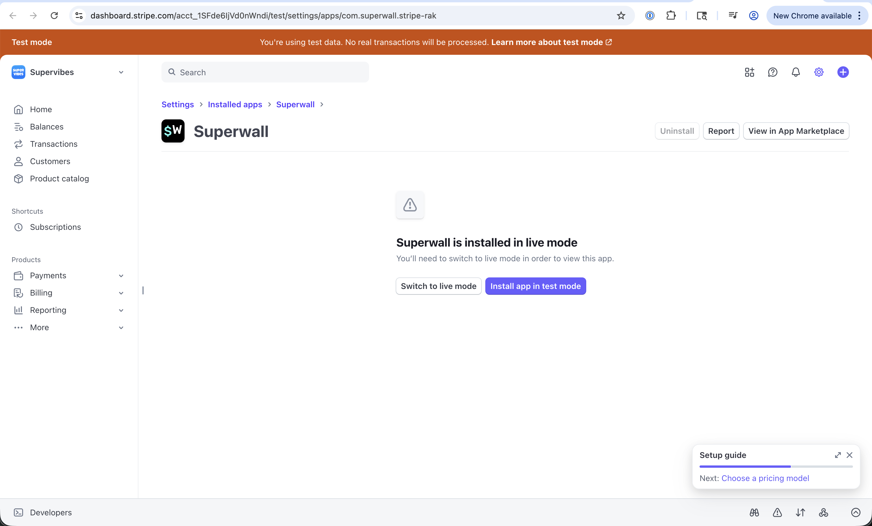 The Superwall Stripe app provides both live and test mode keys. Make sure you're in the correct mode in your Stripe dashboard when copying keys.